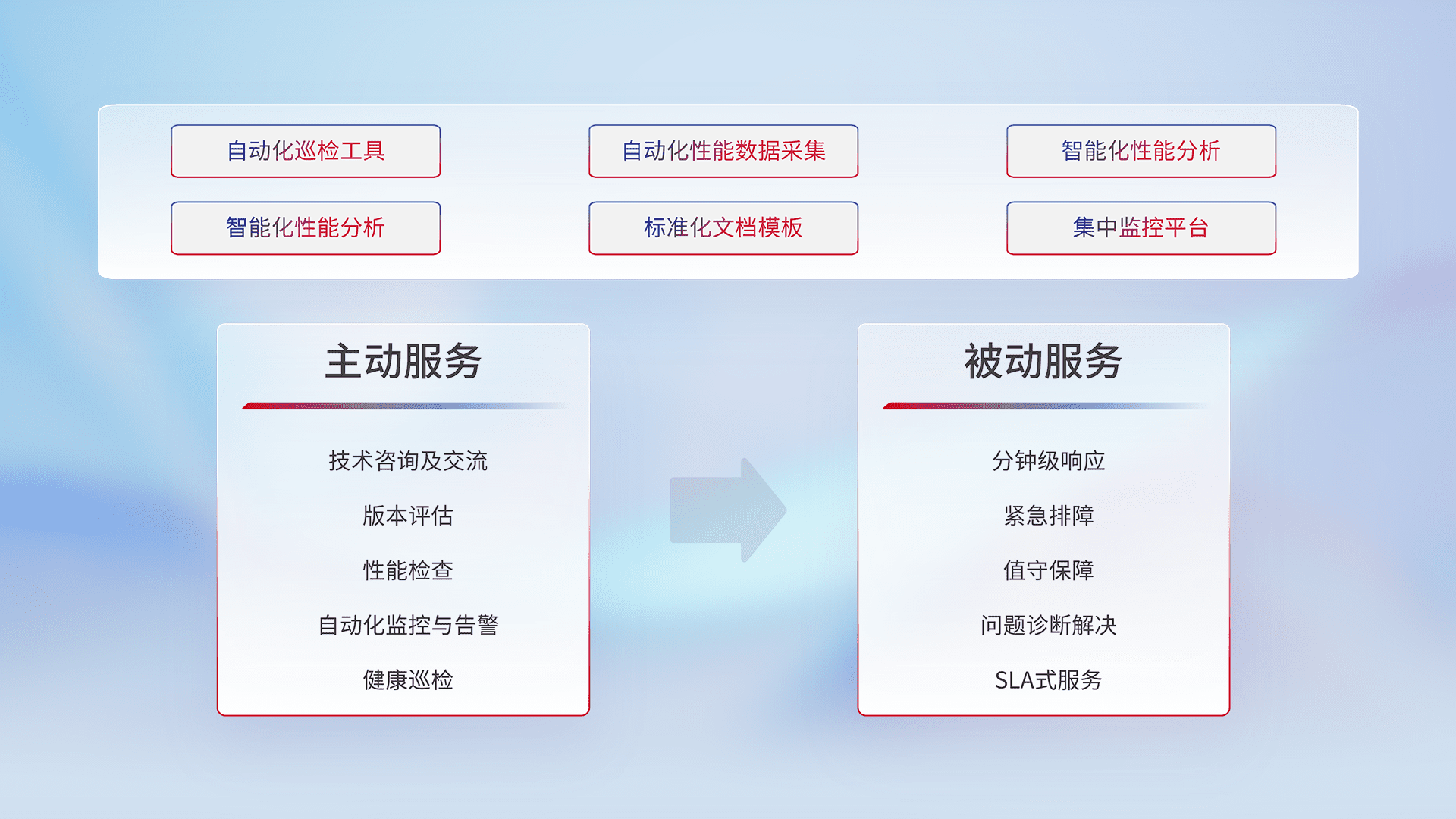智能化工具和标准化文档,,,,保障服务质量,,提供主动服务(包含技术咨询、、、、版本评估、、性能检查、、自动化监控与告警、、、、健康巡检)和被动服务包含(分钟级响应、、、紧急排障、、值守保障、、问题诊断解决、、、、SLA服务)。。。